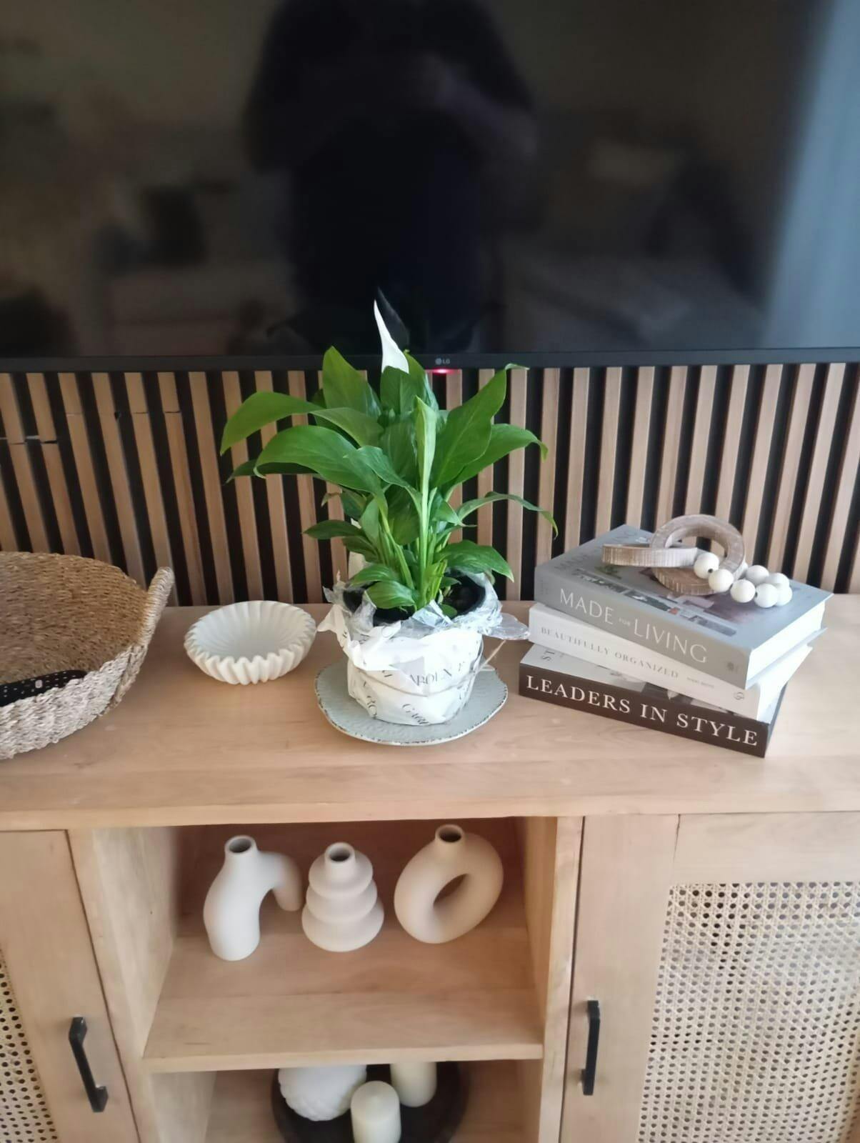 Spathiphyllum (mide entre 45-55cm), también conocida como "Lirio de la Paz" o "Cuna de Moisés" es una planta que tiene frondosas hojas verdes, delicadas flores blancas y que es conocida por atraer la paz, la prosperidad y por llenar los espacios de energía positiva. Es una planta que se adapta a distintos niveles de luminosidad, por lo que tendrás muchos espacios para elegir donde ponerla. Se verá genial en espacios como el Living, Oficina, Sala de Estar, Dormitorio, Cocina o Baño.
