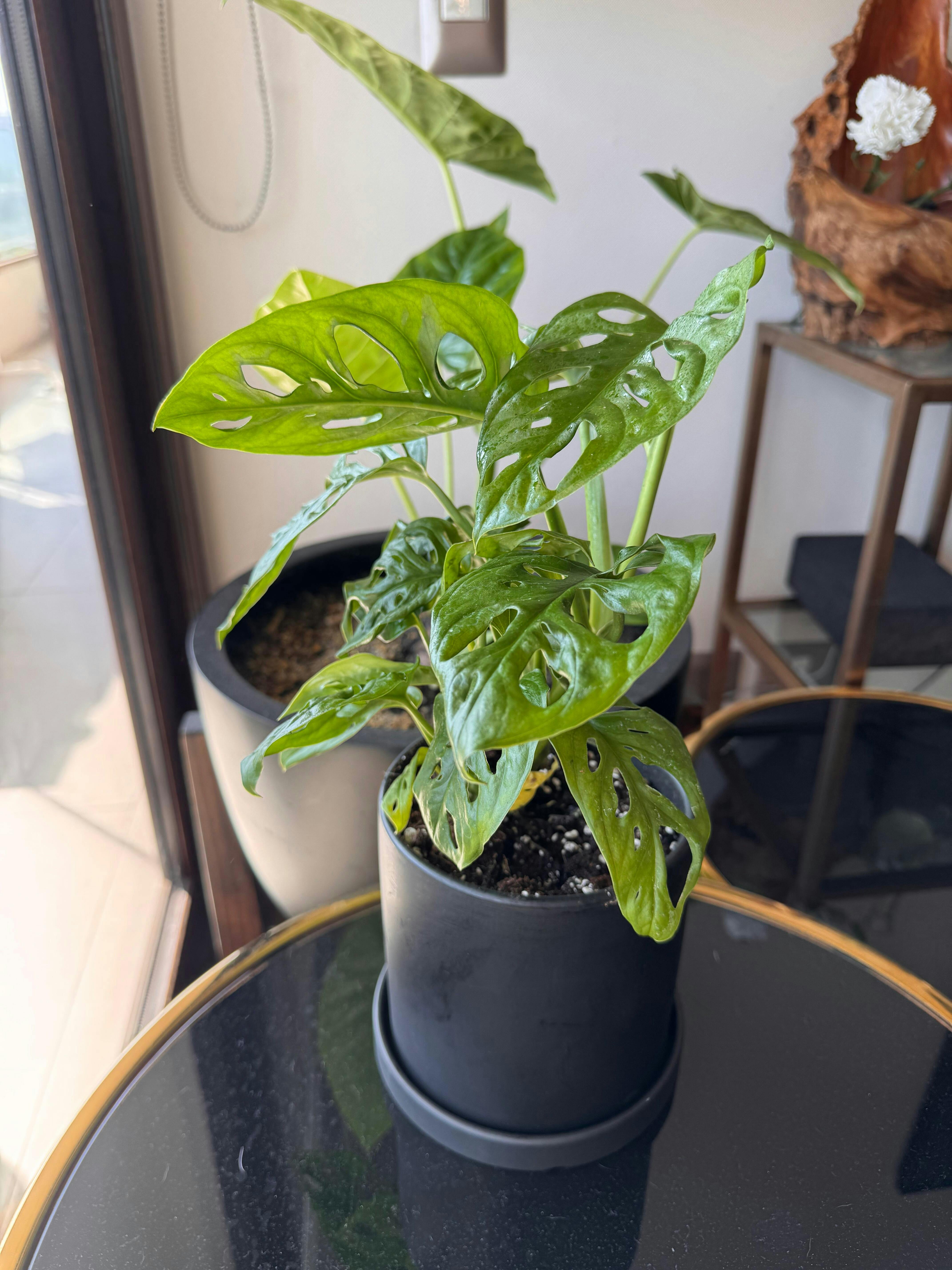 La monstera esqueleto, también conocida como Monstera adansonii, es una planta tropical muy decorativa, famosa por sus hojas verdes con perforaciones naturales que parecen pequeños esqueletos. Es de crecimiento rápido y puede usarse tanto como planta colgante o guiada sobre un tutor, aportando un look selvático y moderno a cualquier espacio interior.